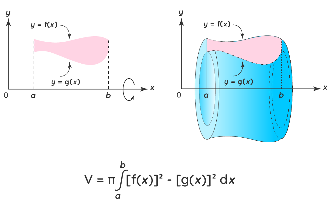\( V = \pi \displaystyle \int_{a}^{b} \left[ R(x)^2 – r(x)^2 \right] \, dx \)