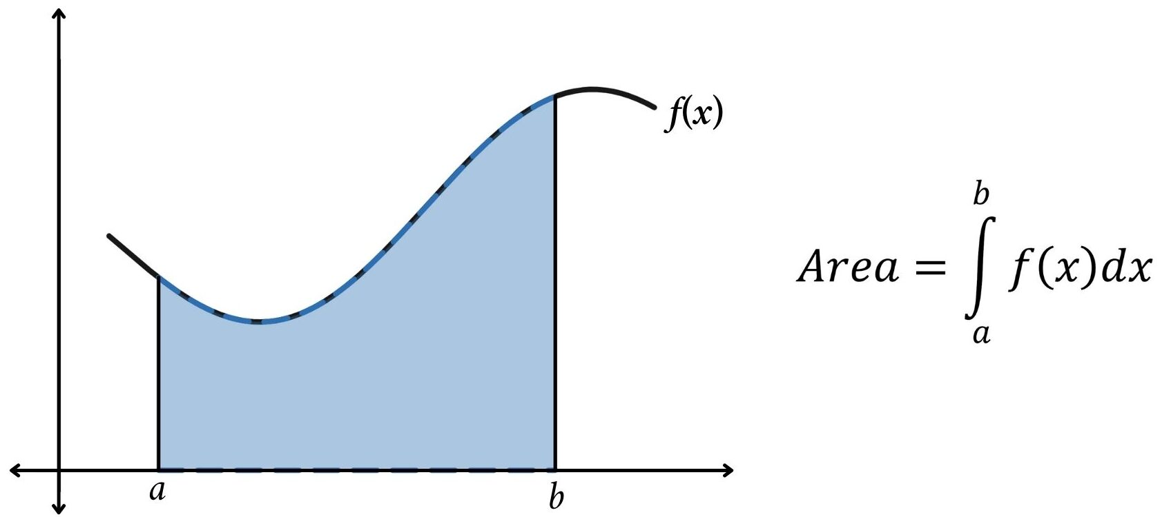 The definite integral \( \displaystyle \int_{a}^{b} f(x) \, dx \) measures the net signed area between the graph of \( y = f(x) \) and the x-axis from \( x = a \) to \( x = b \).