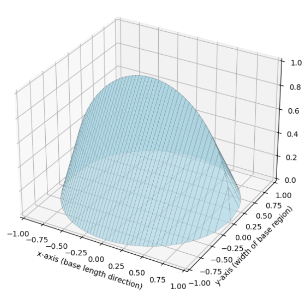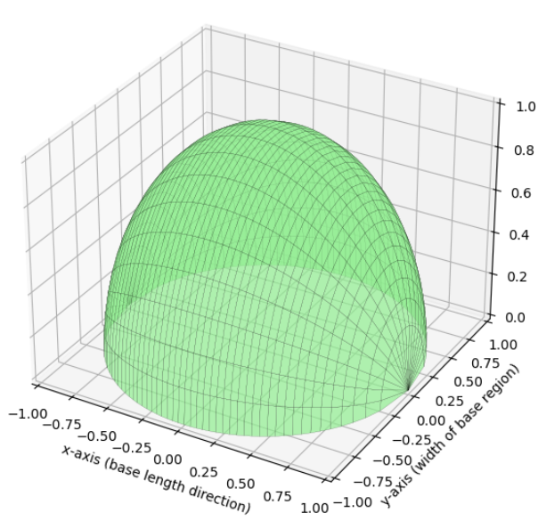 Here, the diameter is \( D = (4 – y^{2}) – 0 = 4 – y^{2} \). Radius: \( r = \dfrac{4 – y^{2}}{2} \) Area of each cross section: \( A(y) = \dfrac{1}{2} \pi \left( \dfrac{4 – y^{2}}{2} \right)^{2} = \dfrac{\pi}{8} \left( 4 – y^{2} \right)^{2} \)