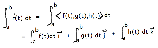 $ \int_{a}^{b} \mathbf{r}(t) \, dt = \left\langle \int_{a}^{b} f(t) \, dt , \; \int_{a}^{b} g(t) \, dt , \; \int_{a}^{b} h(t) \, dt \right\rangle $
