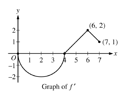 Let \(f\) be a differentiable function with \(f(4)=3\). On the interval \(0\le x\le 7\), the graph of \(f’\), the derivative of \(f\), consists of a semicircle and two line segments, as shown in the figure above.