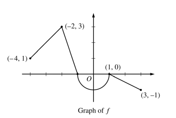 Let f be the continuous function defined on [-4, 3] whose graph, consisting of three line segments and a semicircle centered at the origin, is given above. Let g be the function given by \(g(x)=\int_1^x f(t) dt\).