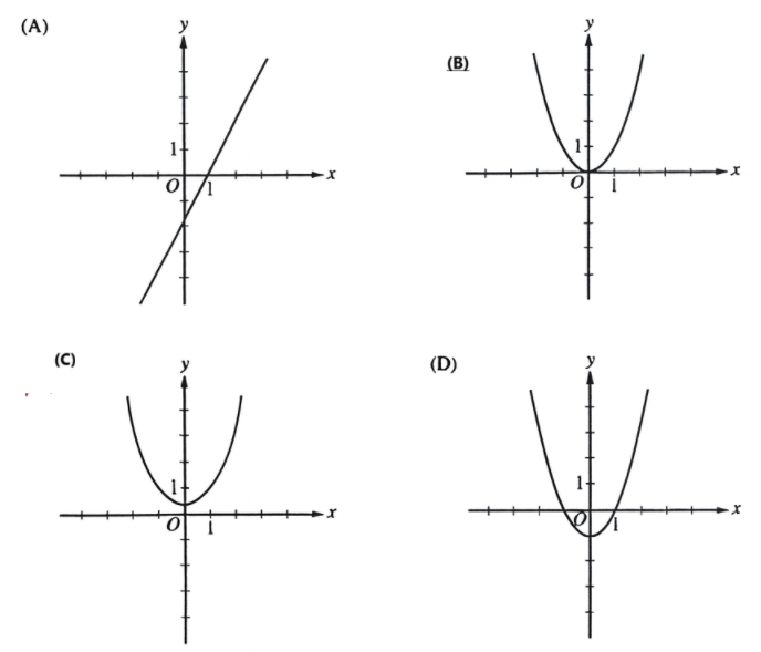 The figure shows the graph of a function \(f\) (a line with positive slope). If \( \displaystyle g(x)=\int_{1}^{x} f(t)\,dt \), which of the following could be the graph of \(g\)?