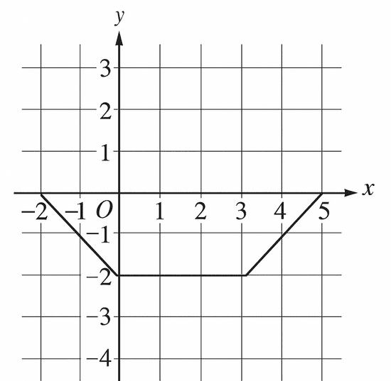 From areas of the three line segments in the graph, \(\displaystyle\int_{-2}^{5}f(x)\,dx=-10\).