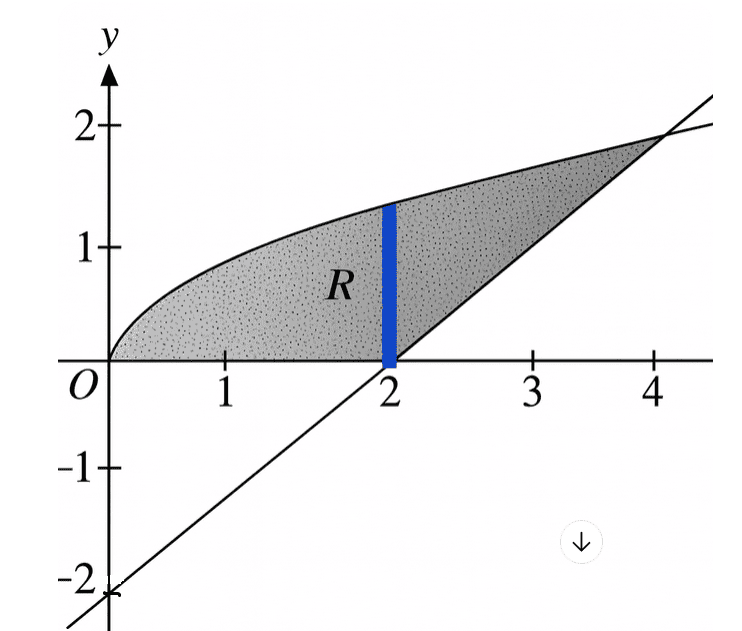 Let \(R\) be the shaded region bounded by the graph of \(y=\sqrt{x}\), the graph of \(y=x-2\), and the \(x\)-axis, as shown. Which of the following gives the volume of the solid generated when \(R\) is revolved about the \(x\)-axis?