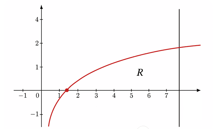 Vertical slices (with \(x\) as variable) give the area as \(\displaystyle \int_{1}^{e^{2}}\ln x\,dx\) since \(\ln x\ge0\) on \([1,e^{2}]\). This is I.