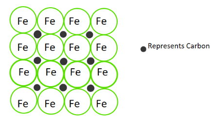 Step 1: In steel, small carbon atoms occupy interstitial spaces between larger iron atoms.