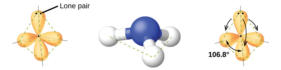 | Trigonal Pyramidal | 3 bonds, 1 lone pair | < 109.5° (~107°) | \(\mathrm{NH_3}\) |