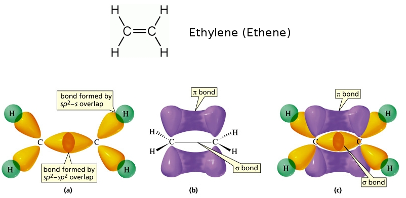 Step 2: Ethene (\(\mathrm{C_2H_4}\)) – Carbon–carbon bond is a double bond → 1 σ + 1 π bond (sp²–sp² overlap + p–p side overlap). – C–H bonds are σ bonds. – Restricted rotation around the double bond → possible cis/trans isomers.
