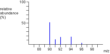 The 5 peaks in the mass spectrum shows that there are 5 isotopes of zirconium – with relative isotopic masses of \(90,91,92,94\) and 96 on the \({ }^{12} \mathrm{C}\) scale.