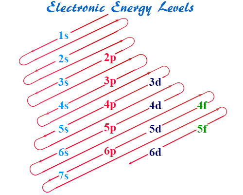 Electrons occupy energy levels (shells), divided into subshells (s, p, d, f) and orbitals: