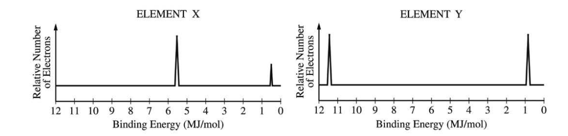 The complete photoelectron spectra of neutral atoms of two unknown elements, X and Y, are shown above.(B) Element X has a greater ionization energy than element Y does.