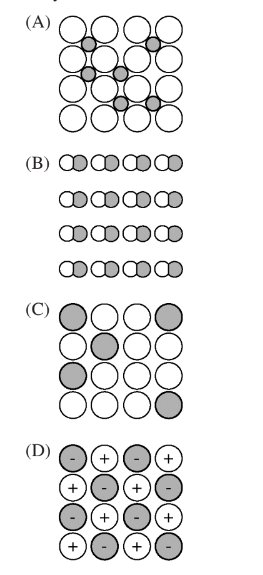 The other diagrams do not accurately capture this interstitial alloy microstructure. Diagrams (B) and (C) show a random distribution of atoms, not distinguishing the interstitial occupation. Diagram (D) has a different pattern altogether.