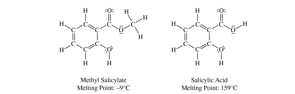 Molecules of salicylic acid have more hydrogen-bonding sites than molecules of methyl salicylate have, which leads to stronger intermolecular forces and a higher melting point for salicylic acid.