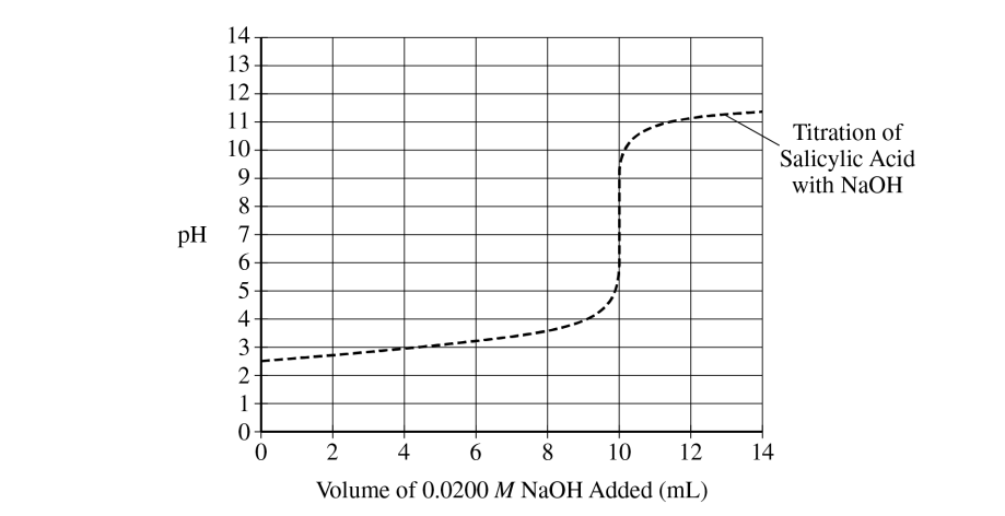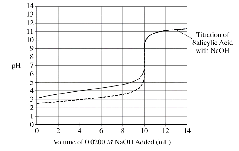 • The conjugate base, \( \mathrm{C}_{7}\mathrm{H}_{5}\mathrm{O}_{3}^{-} \). When \( \mathrm{pH} = 4 \), the titration is beyond the half-equivalence point, where \( [\mathrm{HC}_{7}\mathrm{H}_{5}\mathrm{O}_{3}] = [\mathrm{C}_{7}\mathrm{H}_{5}\mathrm{O}_{3}^{-}] \). Thus, \( [\mathrm{C}_{7}\mathrm{H}_{5}\mathrm{O}_{3}^{-}] \) must be greater than \( [\mathrm{HC}_{7}\mathrm{H}_{5}\mathrm{O}_{3}] \).