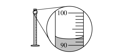 The liquid level should be read at the bottom of the meniscus. In the magnified scale, the meniscus is at \( 92.0\ \mathrm{mL} \).