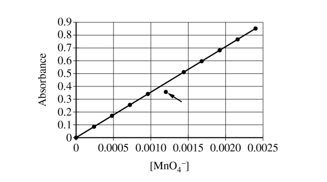 Since the marked point is below the best-fit line, its measured absorbance is too small for its stated concentration. A little leftover water in the cuvette would cause exactly that.