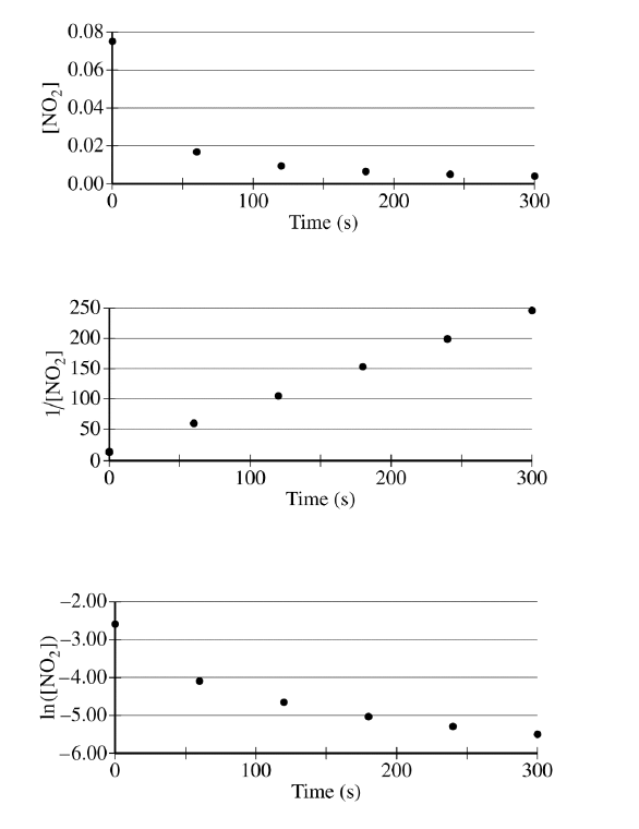 For comparison, a zero-order reaction would give a linear plot of \( [\mathrm{NO_2}] \) versus time, and a first-order reaction would give a linear plot of \( \ln[\mathrm{NO_2}] \) versus time. Since neither of those is linear here, the second-order model is the correct one.