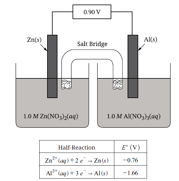 • \( E^\circ_{\mathrm{cell}} = 1.50\ \mathrm{V} + 0.76\ \mathrm{V} = 2.26\ \mathrm{V} \)