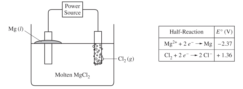 Molten MgCl2 can be decomposed into its elements if a sufficient voltage is applied using inert electrodes. The products of the reaction are liquid Mg (at the cathode) and Cl2 gas (at the anode). A simplified representation of the cell is shown above. The reduction half-reactions related to the overall reaction in the cell are given in the table.