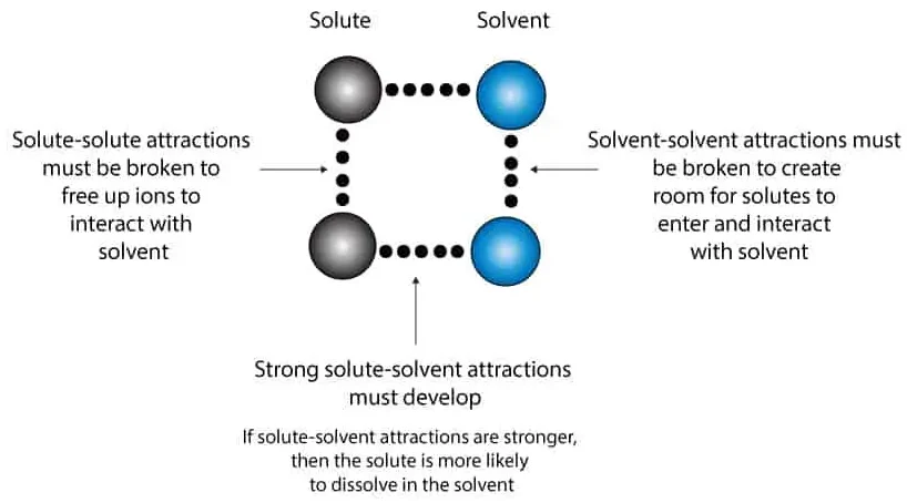 - Solute–solvent attractions (new interactions formed during dissolution)