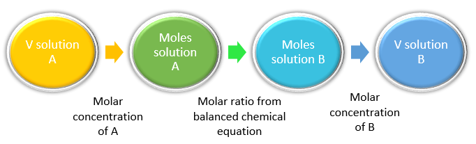 \(\mathrm{(P, V, T) \xrightarrow{PV = nRT} n_{gas} \xrightarrow{stoichiometry} n_{product} \xrightarrow{M = \frac{n}{V}} M_{solution}}\)