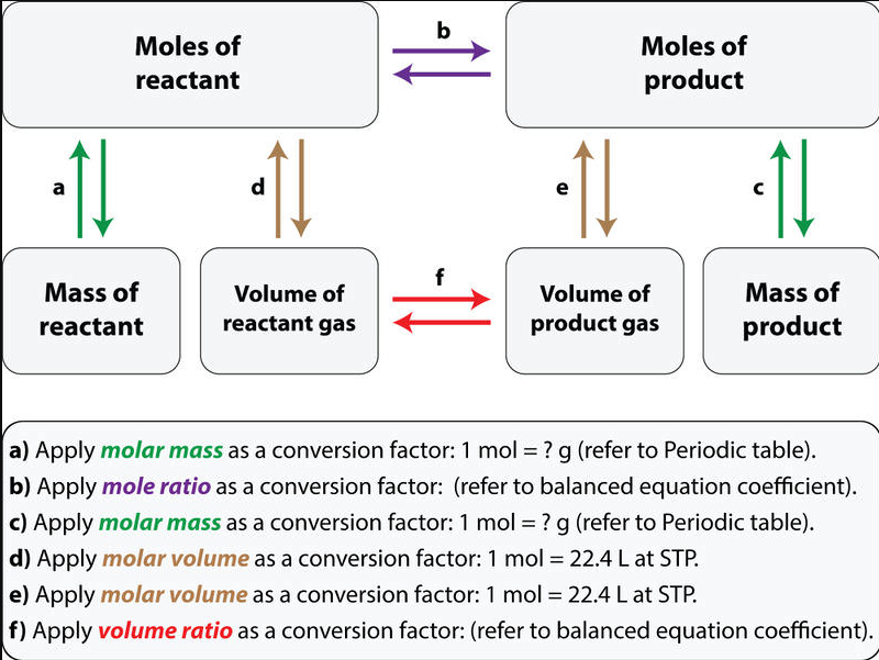 - Mass–Mass relationship: Using molar mass (\(\mathrm{g/mol}\)), we can convert between mass and moles.