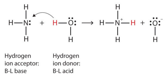 | Brønsted–Lowry Base | Accepts a proton (\(\mathrm{H^+}\)) from another substance. | \(\mathrm{NH_3 + H_2O \rightarrow NH_4^+ + OH^-}\) |