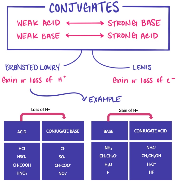 - Each acid has a conjugate base formed by removing one proton.