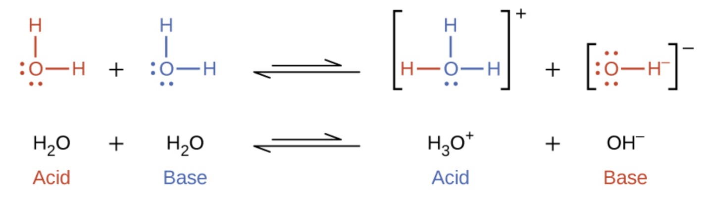 - One molecule acts as an acid, the other as a base → self-ionization.