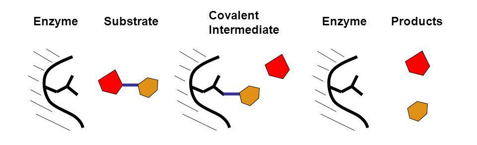 - A new covalent bond is temporarily formed between the catalyst and reactant.