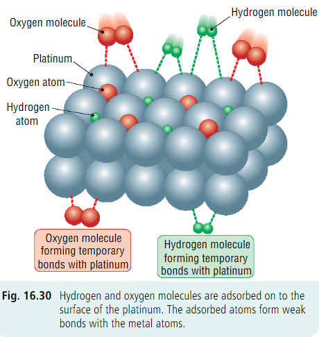 - The reaction occurs more easily on the metal surface because adsorption weakens bonds in reactants.