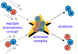 In most chemical reactions, only a small fraction of molecular collisions lead to product formation. A collision is successful only if the reacting molecules collide with both: