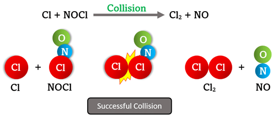 In the reaction \( \mathrm{Cl + NOCl \rightarrow Cl_2 + NO} \), what must occur for the collision between \( \mathrm{Cl} \) and \( \mathrm{NOCl} \) to successfully produce \( \mathrm{Cl_2} \) and \( \mathrm{NO}? \)