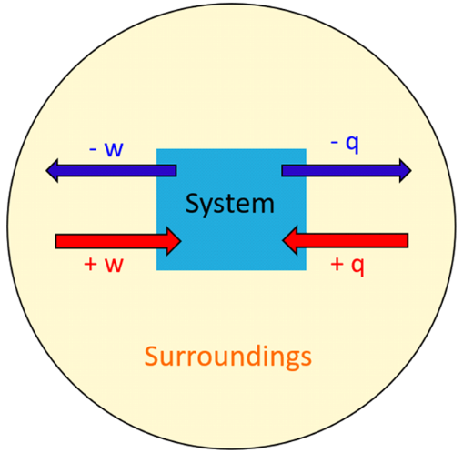 Step 3: Energy flow: \( \mathrm{q_{system} > 0} \) (system gains energy), \( \mathrm{q_{surroundings} < 0} \) (surroundings lose energy).