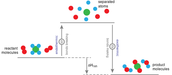 \( \mathrm{\Delta H = \sum E_{bonds\ broken} – \sum E_{bonds\ formed}} \)