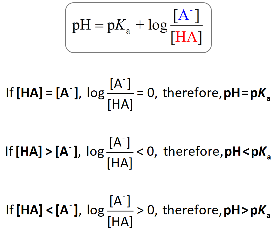 - When \( \mathrm{[HA] > [A^-]} \), the solution is more acidic (pH < pKa).