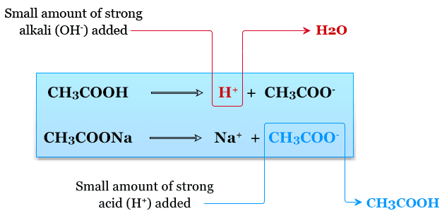 Step 1: The added \( \mathrm{H^+} \) ions react with acetate ions \( \mathrm{CH_3COO^-} \):