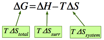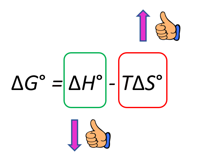 \( \mathrm{\Delta G^\circ = \Delta H^\circ – T\Delta S^\circ} \)