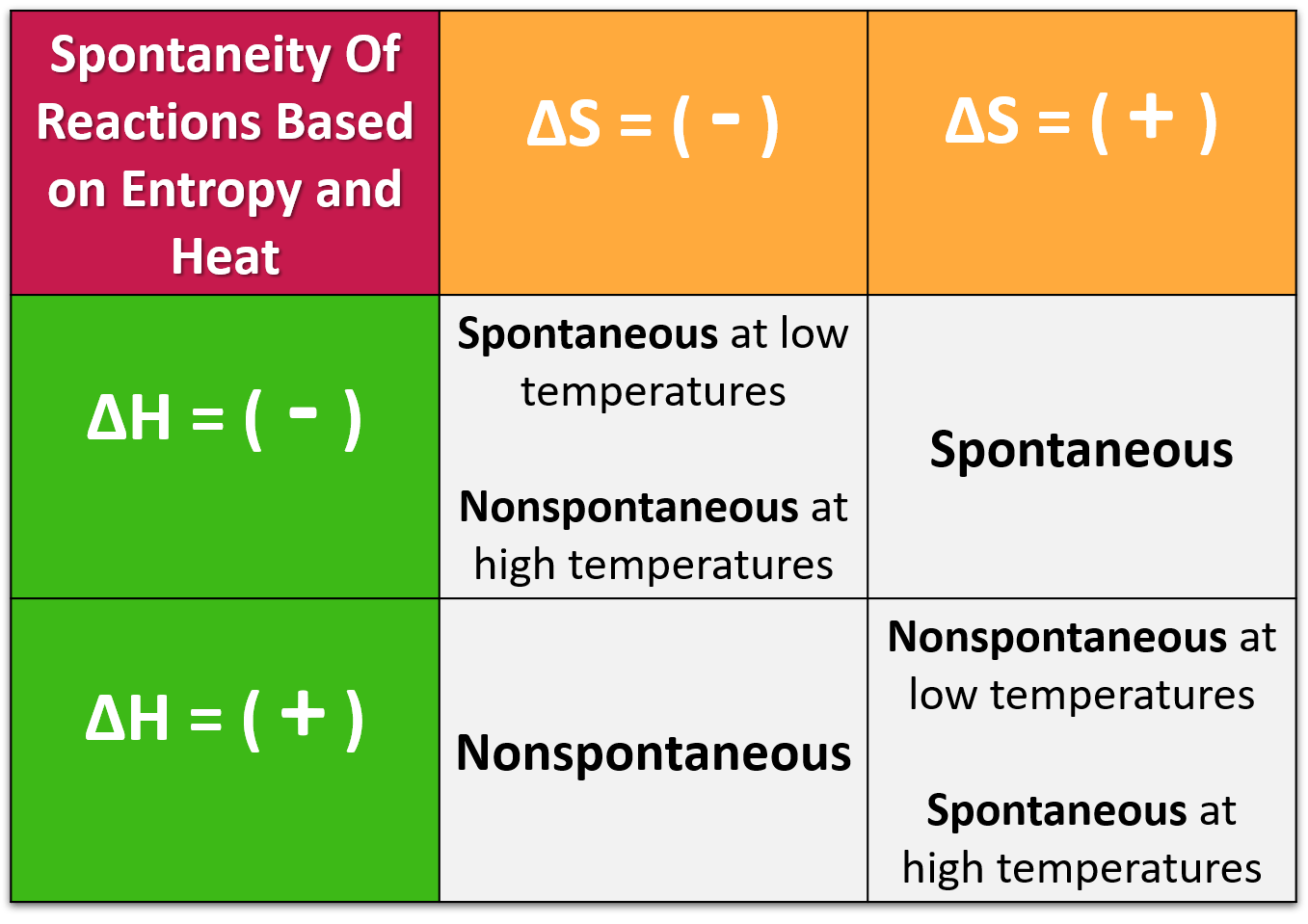 | \( \mathrm{\Delta H} \) | \( \mathrm{\Delta S} \) | Temperature Dependence | Thermodynamic Favorability |