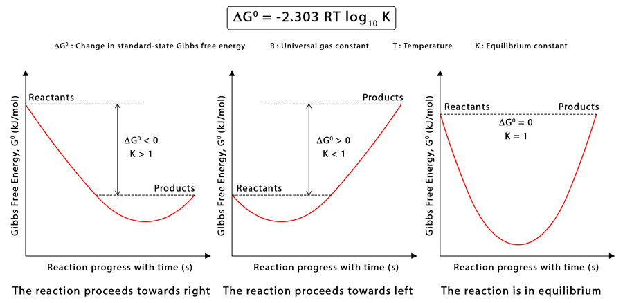 | \( \mathrm{\Delta G^\circ = 0} \) | \( \mathrm{K = 1} \) | Reactants and products equally favored | System at equilibrium |