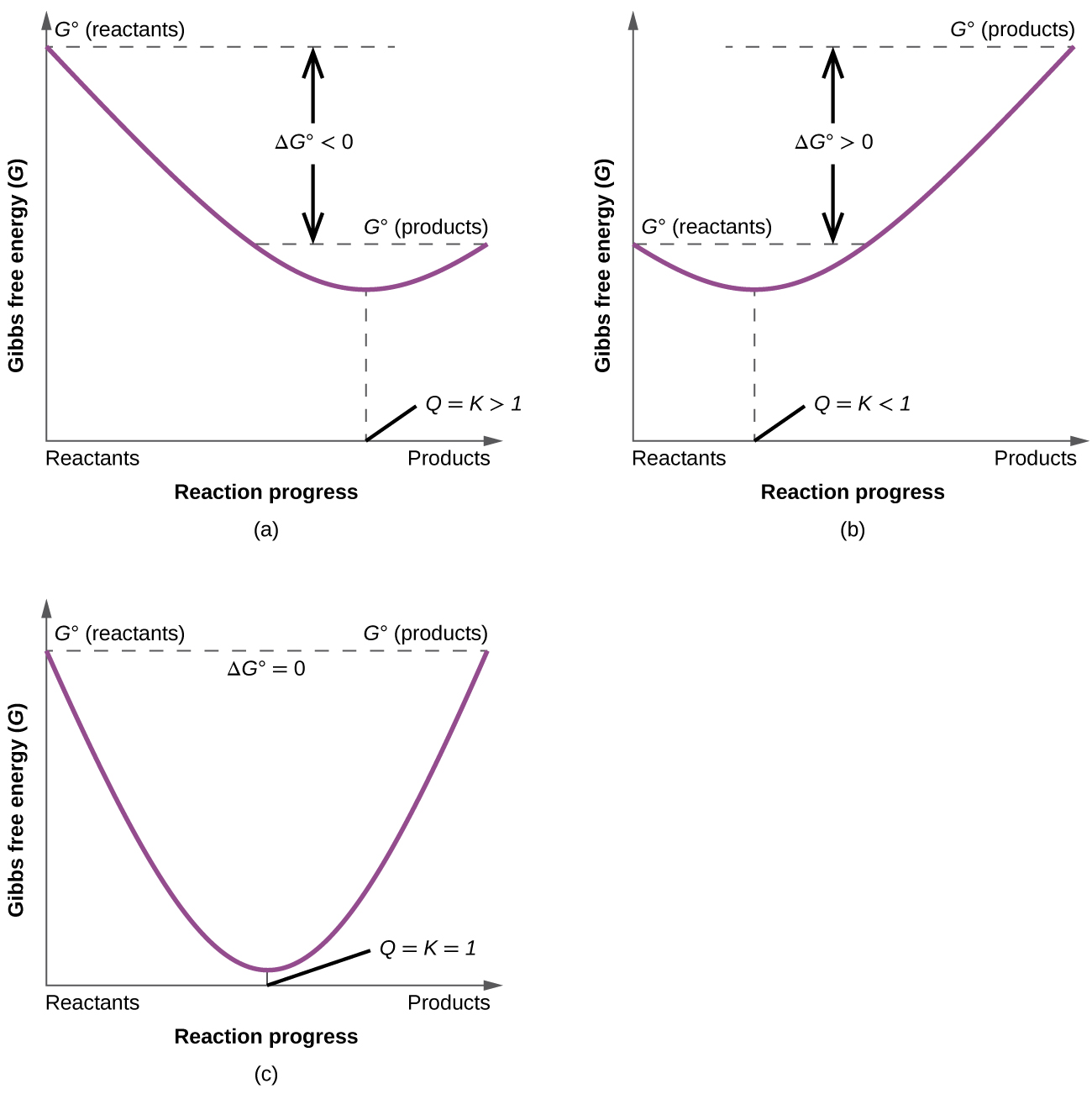 | \( \mathrm{\Delta G^\circ > 0} \) | \( \mathrm{K < 1} \) | Reactants favored at equilibrium | Not thermodynamically favored (nonspontaneous) |