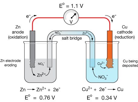 - \( \mathrm{E^\circ_{cell} = +1.10\ V} \) → spontaneous reaction.