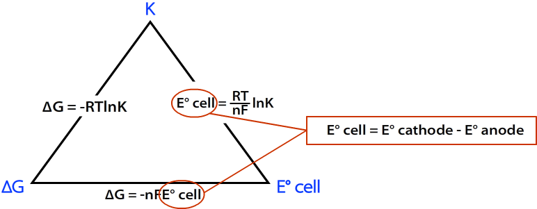 - If the redox reaction is spontaneous → \( \mathrm{\Delta G^\circ < 0} \), \( \mathrm{E^\circ_{cell} > 0} \)