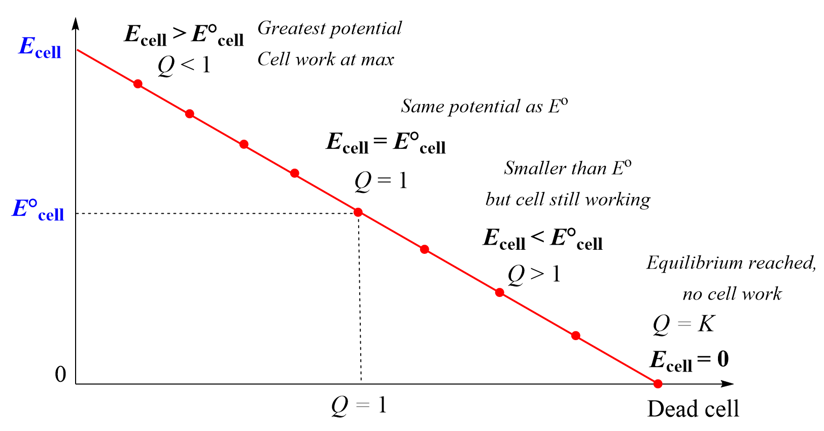 - When \( \mathrm{Q = K} \): system at equilibrium, \( \mathrm{E_{cell} = 0} \)