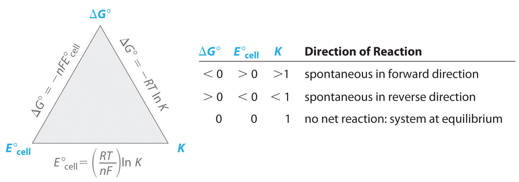 | At equilibrium | \( \mathrm{Q = K} \) | \( \mathrm{E_{cell} = 0} \) | No net electron flow |