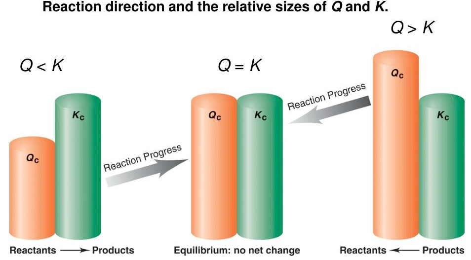 | Governing quantity | Equilibrium constant \( \mathrm{K} \) | Reaction quotient \( \mathrm{Q} \) |