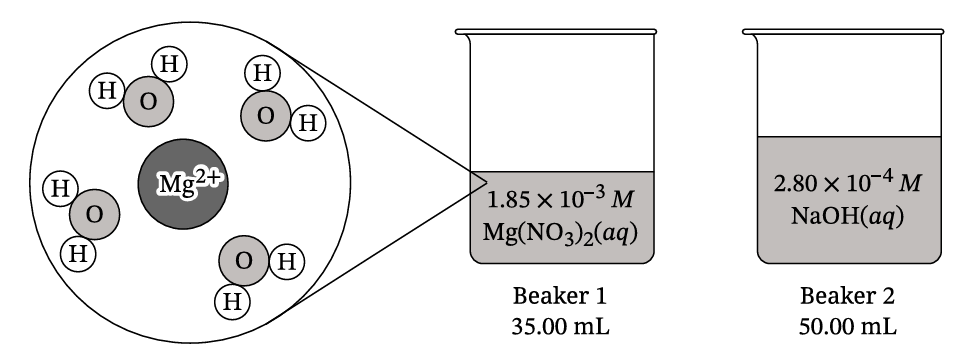 D. A student combines 35.00 mL of \(1.85 \times 10^{-3} \, M \, \text{Mg}(NO_3)_2(aq)\) with 50.00 mL of \(2.80 \times 10^{-4} \, M \, \text{NaOH}(aq)\). Calculate \(\left[ \text{Mg}^{2+} \right]\) after the two solutions are combined but before any reaction takes place. (Assume that volumes are additive.)