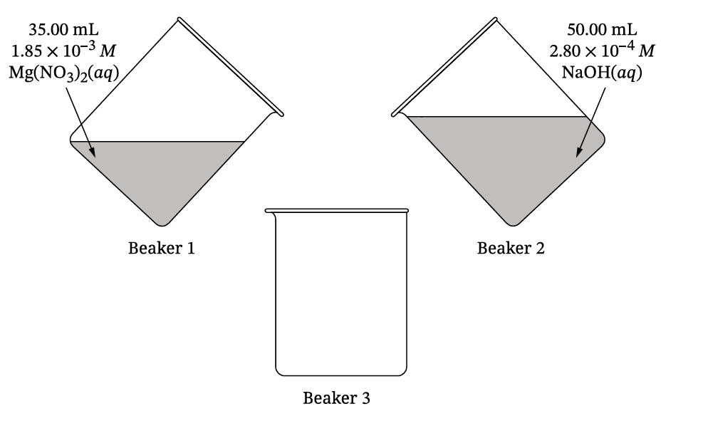 ii. After the two solutions are combined in beaker 3 as described in part D, but before any reaction takes place, \(\left[ \text{OH}^- \right] = 1.65 \times 10^{-4} \, M\). Using your answer to part D, calculate the value of the reaction quotient, Q.