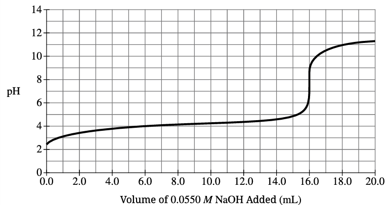 From titration curve, equivalence point is at 16.0 mL NaOH. Step 1: Calculate moles of NaOH: \( 0.0160 \, \text{L} \times 0.0550 \, \text{M} = 8.80 \times 10^{-4} \, \text{mol} \, \text{NaOH} \) Step 2: At equivalence point, moles HAsc = moles NaOH: \( 8.80 \times 10^{-4} \, \text{mol} \, \text{HAsc} \) Step 3: Calculate concentration: \( \frac{8.80 \times 10^{-4} \, \text{mol}}{0.0100 \, \text{L}} = 0.0880 \, \text{M} \) ✅ Answer: \( \boxed{0.0880 \, \text{M}} \)